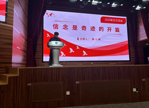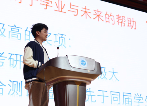 首位进行分享的是2023级的陈小爽同学。他以4.29的学分绩点位列年级第一,曾获国家奖学金、学校特等奖学金,并获得2024年度青春榜样“学习之星”。他结合多次参加学科专业竞赛的亲身经历,分享了自己平衡学业与兴趣爱好的方法。随后,他从升学、就业和其他方向三个角度为新生梳理了可能的路径,鼓励大家保持求知的心态,摒弃自我设限,做到“向外探索,向内思考,向下扎根,向阳而生”,以积极从容的姿态迎接大学生活的挑战。