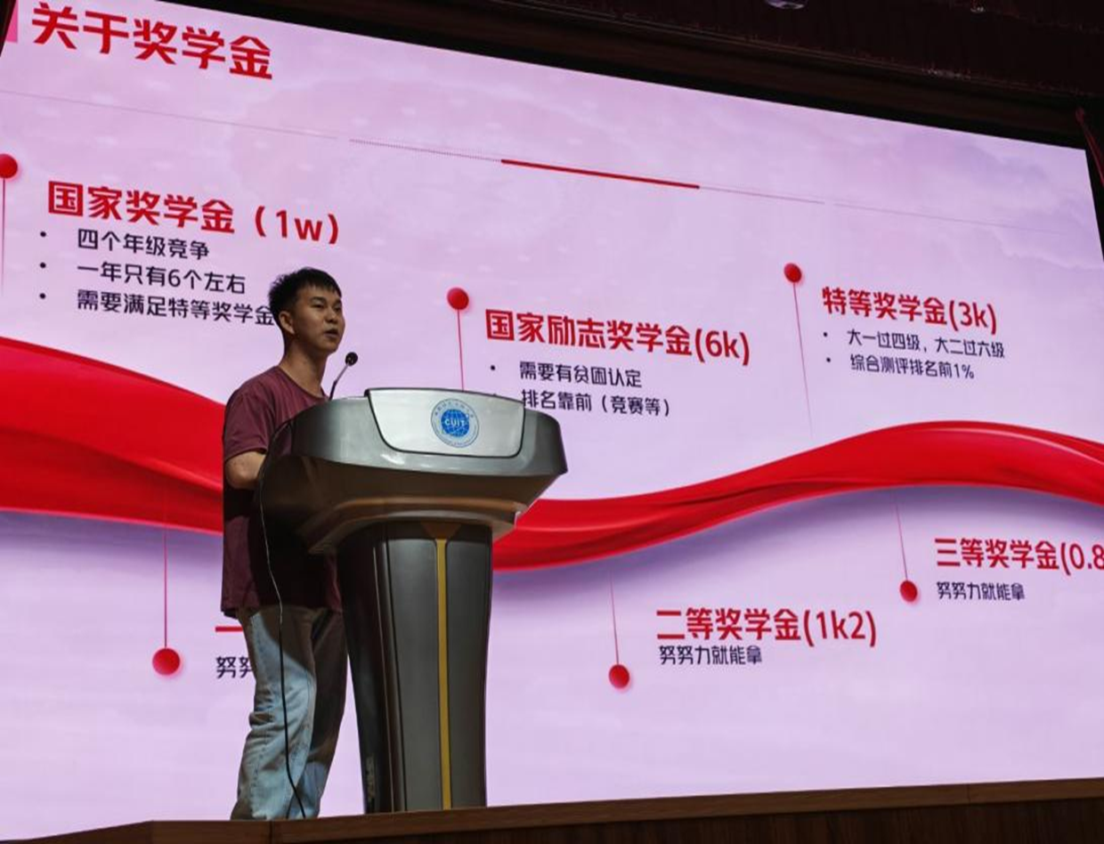 荣获2024年度“十佳青年学生”称号的周兆琦同学,以自身丰富多元的大学经历拓展了新生对成长可能性的认知。他曾在多项高水平学科竞赛中斩获佳绩,包括美国大学生数学建模竞赛特等奖提名(Finalist,前2%)、全国大学生数学建模竞赛四川省一等奖等11项国家级和省级奖项。他以“没有击败你的,只会让你更强大”作为开场,从奖学金政策切入,鼓励新生重视学业、积极争取。他引用“意识具有主观能动性”,建议从学分绩点提升、论文发表、参加学科竞赛与社会实践等方面不断提升自我。他分享了自己从自学大数据开发、入职知名企业实习,到经历保研并最终选择考公的成长历程,鼓励大家勇于尝试、不断突破自我。他还向新生重点推荐了部分高水平专业赛事,鼓励学生干部在班级中发挥带头作用,共同营造优良学风。
