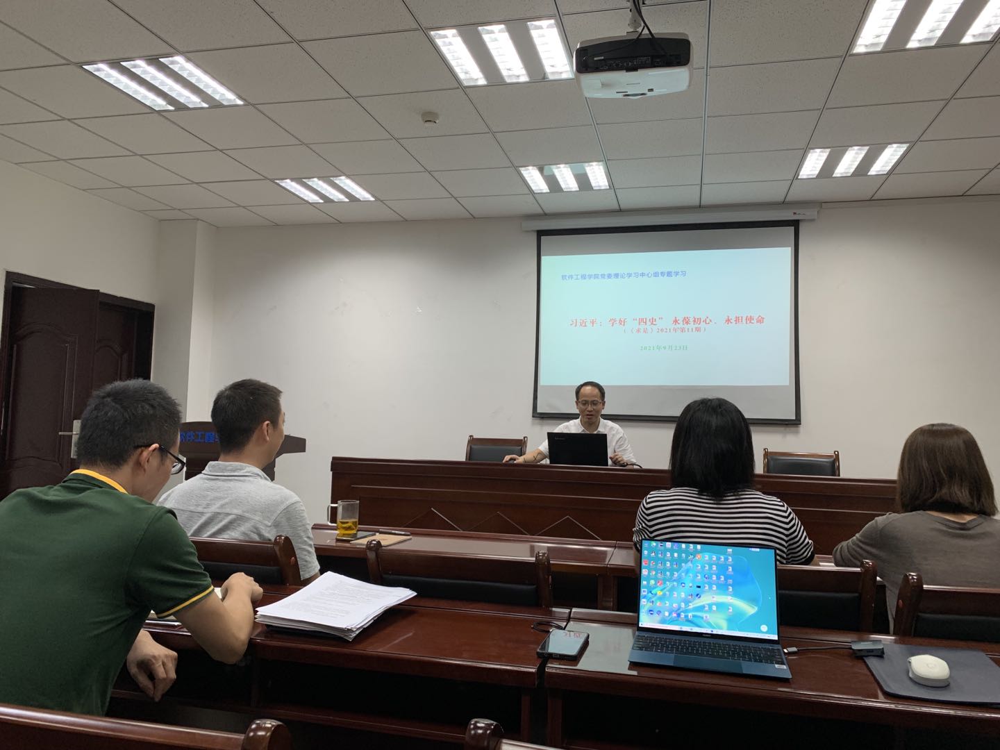 马义华带领中心组成员认真学习了---习近平:学好“四史” 永葆初心、永担使命,《求是》2021年第11期的内容。他从2016年总书记在全国高校思想政治工作会议上的讲话开始讲起,一直讲到总书记在十三届全国人大四次会议青海代表团审议时的讲话。马义华指出,总书记关于“四史”的重要论述为我们学习“四史”提供了最好的理论指导。党员干部要学好党史、新中国史。最后马义华提出各个支部也要认真扎实开展“四史”学习教育,今年是中国共产党成立100周年,在这个重要的时间节点上我们更需要回望历史、展望未来,树立一种历史眼光和历史思维。加强党史、新中国史、改革开放史和社会主义发展史的学习,对于我们总结中国共产党百年历史经验,继往开来、守正创新,保持先进性和纯洁性,确保我们党永葆旺盛生命力和强大战斗力,有着十分重要的理论意义和现实意义。
