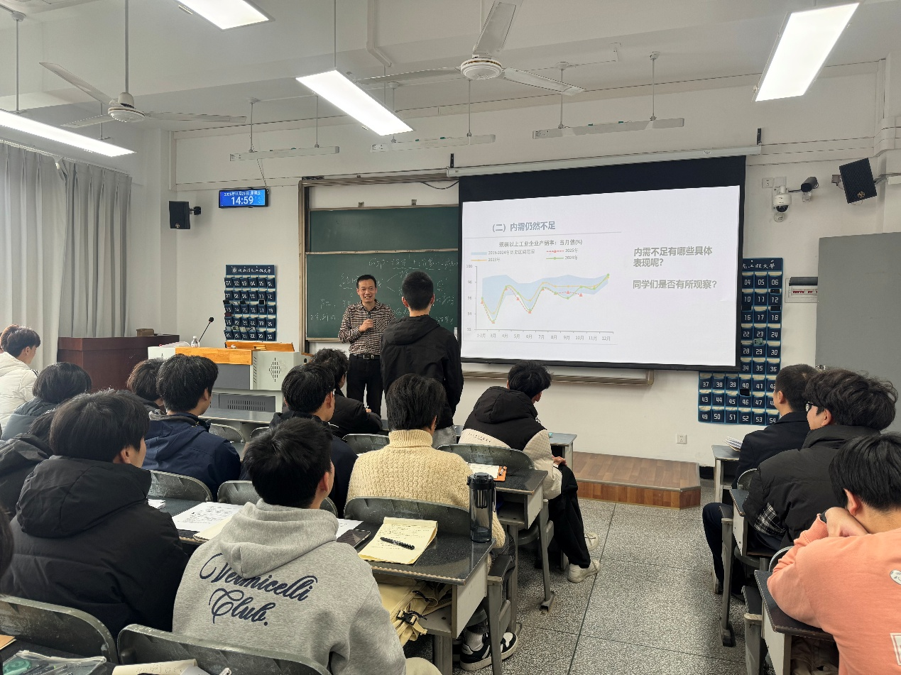 在“中国经济形势分析与展望”板块,杨奇才教授以“辩证视角看发展、数据支撑论趋势”的授课逻辑,从宏观经济四大核心指标切入,系统梳理我国经济运行的“稳”与“进”。他指出,今年以来我国经济在复杂外部环境下展现出强劲韧性,2025年上半年中国经济增速达到5.3%。针对当前经济发展中存在的堵点难点,杨奇才教授结合实例深入剖析 “供强需弱”等内生动力问题,引导学生既看到“宏观数据向好”的整体态势,也理解“微观主体感受温差”的现实原因。同时,他着重强调创新驱动带来的新机遇,我国经济正处于转型升级关键期,让学生清晰认识到“动能稳步转换、创新持续发力”是中国经济的长期走向。