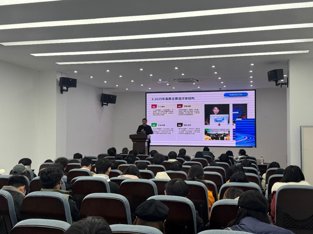宣讲会上,周启忠副院长首先聚焦中国国际大学生创新大赛,全面解读赛事基本情况,重点阐释赛程安排、评审核心要点及参赛核心要求。他强调,双创竞赛既是展示大学生创意理念与项目实践能力的优质平台,更是锤炼团队协作、项目管理及实践应用能力的重要契机。针对备赛关键环节,周启忠副院长从团队精准组建、项目深度调研、商业计划书规范撰写等方面给出具体指导建议,为学子科学规划参赛项目、提升备赛效率提供了清晰路径。
